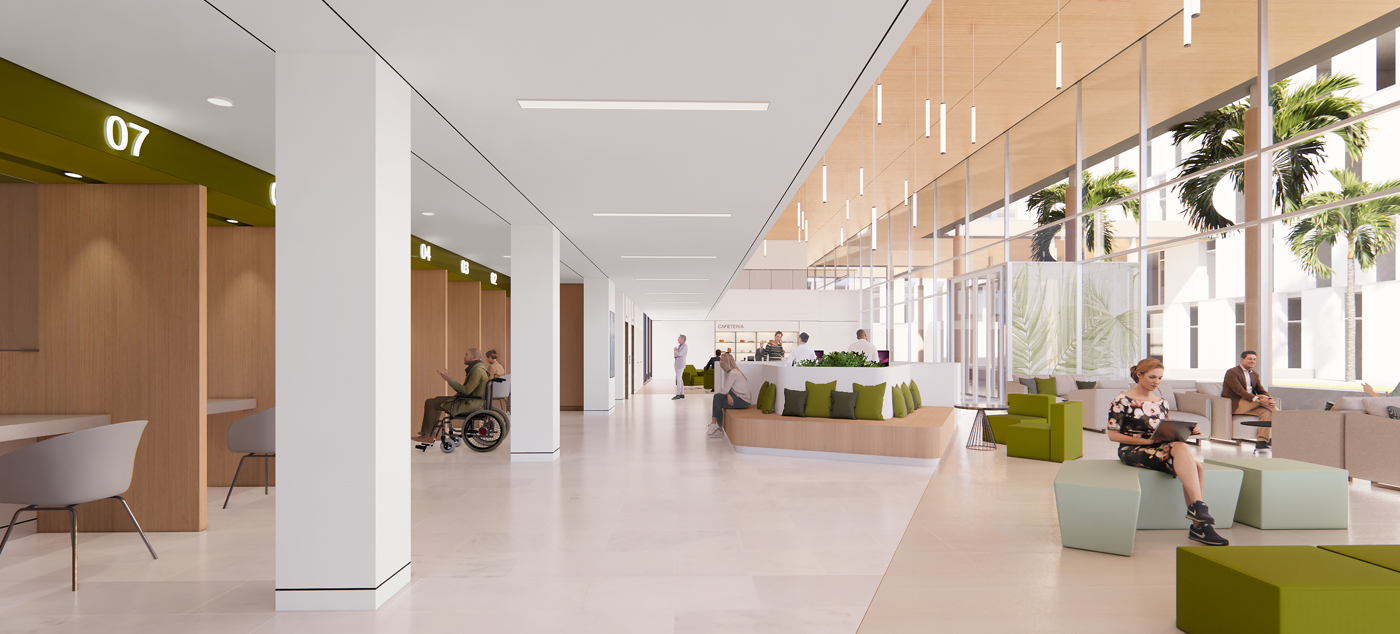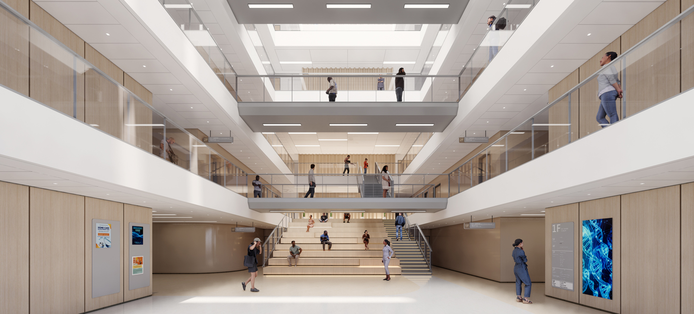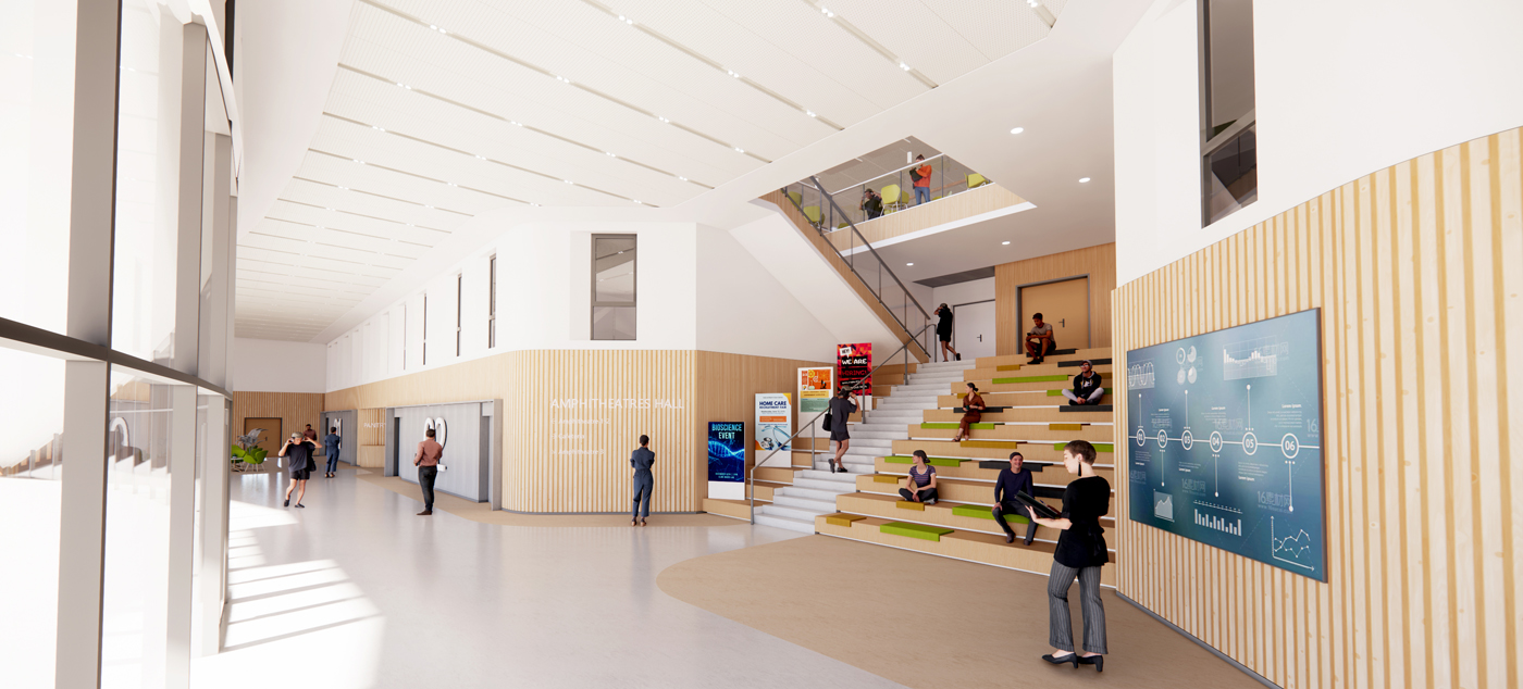 L’organisation intérieure repose sur un atrium central baigné de lumière, qui structure l’ensemble du bâtiment et favorise la ventilation naturelle. Ce cœur symbolise une agora contemporaine, favorisant les échanges entre étudiants, enseignants et professionnels de santé. L’escalier monumental du hall des amphithéâtres complète cette dynamique en devenant un lieu de convergence et d’animation.