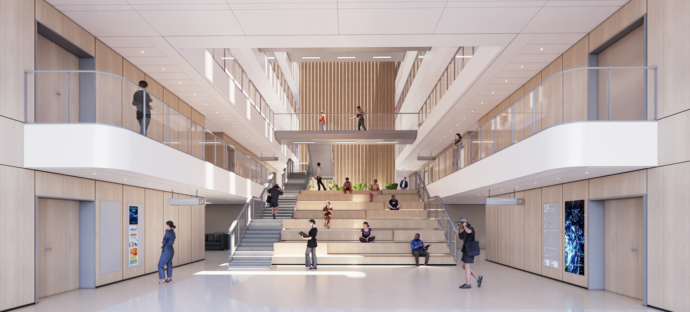 Nous avons imaginé un édifice emblématique, identifiable depuis l’espace public, qui vient renforcer l’ancrage du campus dans son environnement. Son architecture est pensée pour incarner une communauté dynamique, inclusive et collaborative. Rationalité et flexibilité guident notre approche : les espaces sont optimisés pour maîtriser les coûts tout en restant adaptables aux évolutions futures.